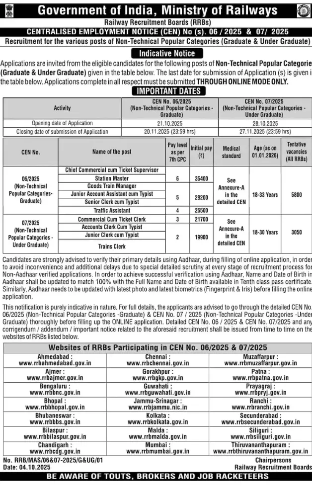 Undergraduate and graduate अभ्यर्थियों के लिए 8850 पदों भर्ती के लिए Short notice RRB NTPC ने जारी कर दिया है इसके साथ ही इसका Detailed Notification official Website पर कर दी जाएगी। Indian Railways ने (CEN 06/2025) और (CEN 07/2025) notice के माध्यम से graduate और अंडर ग्रेजुएट के लिए भर्ती जारी की है।